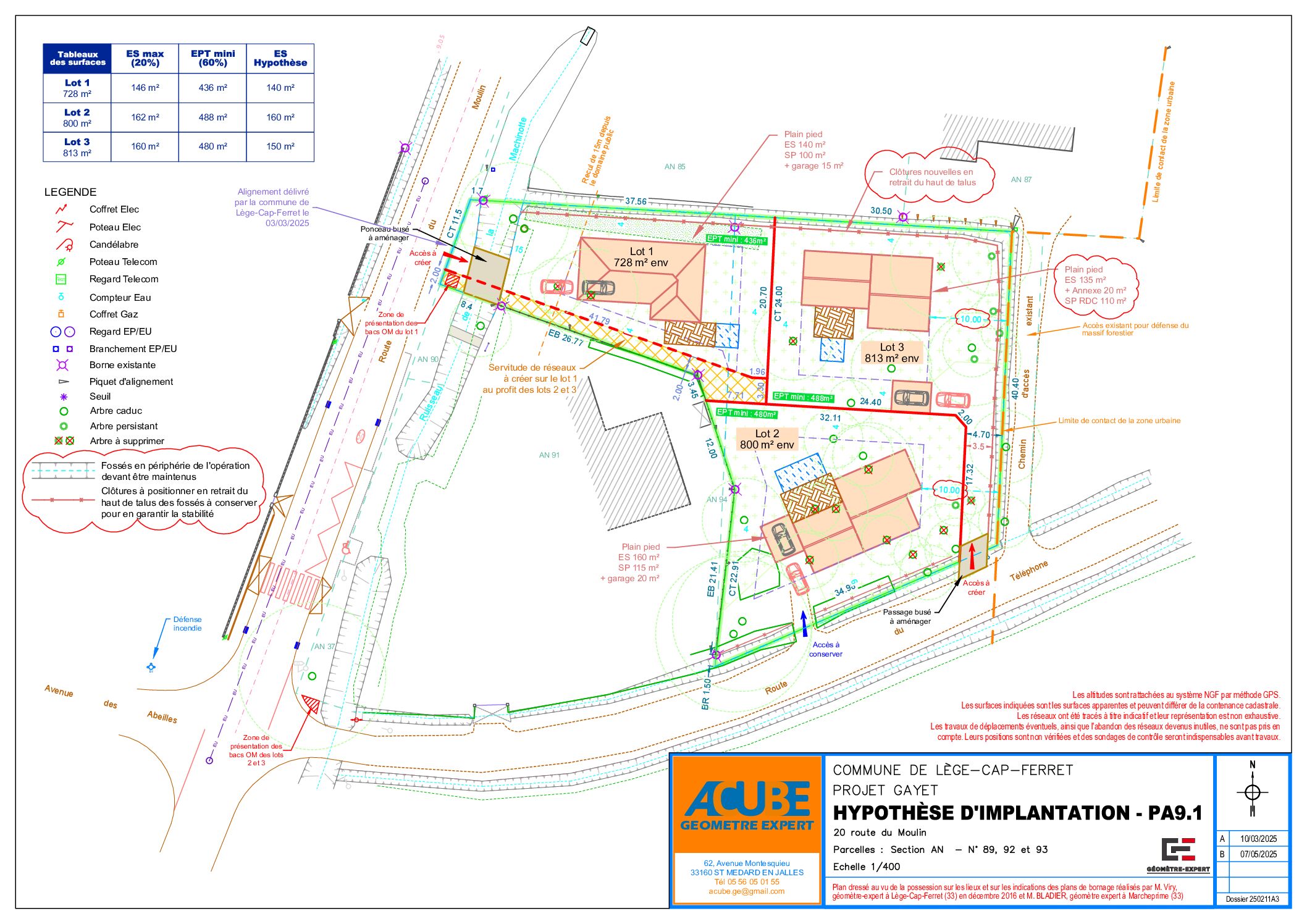 Issu d’un permis d’aménager pour la création d’un lotissement de 3 lots situé à Lège-Cap-Ferret, dans un secteur calme et recherché, terrain à bâtir de 815 m² entièrement viabilisé et offrant de nombreuses possibilités de constructions. Idéal pour un projet résidentiel de qualité, à proximité des plages, du bassin, des commerces et des pistes cyclables.
